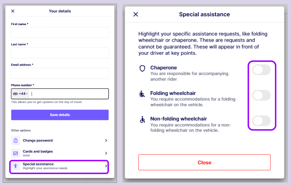 - Toggle on the assistance requirements you need.