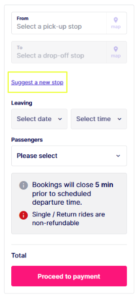 On the booking page, you’ll see a button to suggest a new stop. Click on this button to proceed. See the image below for guidance -